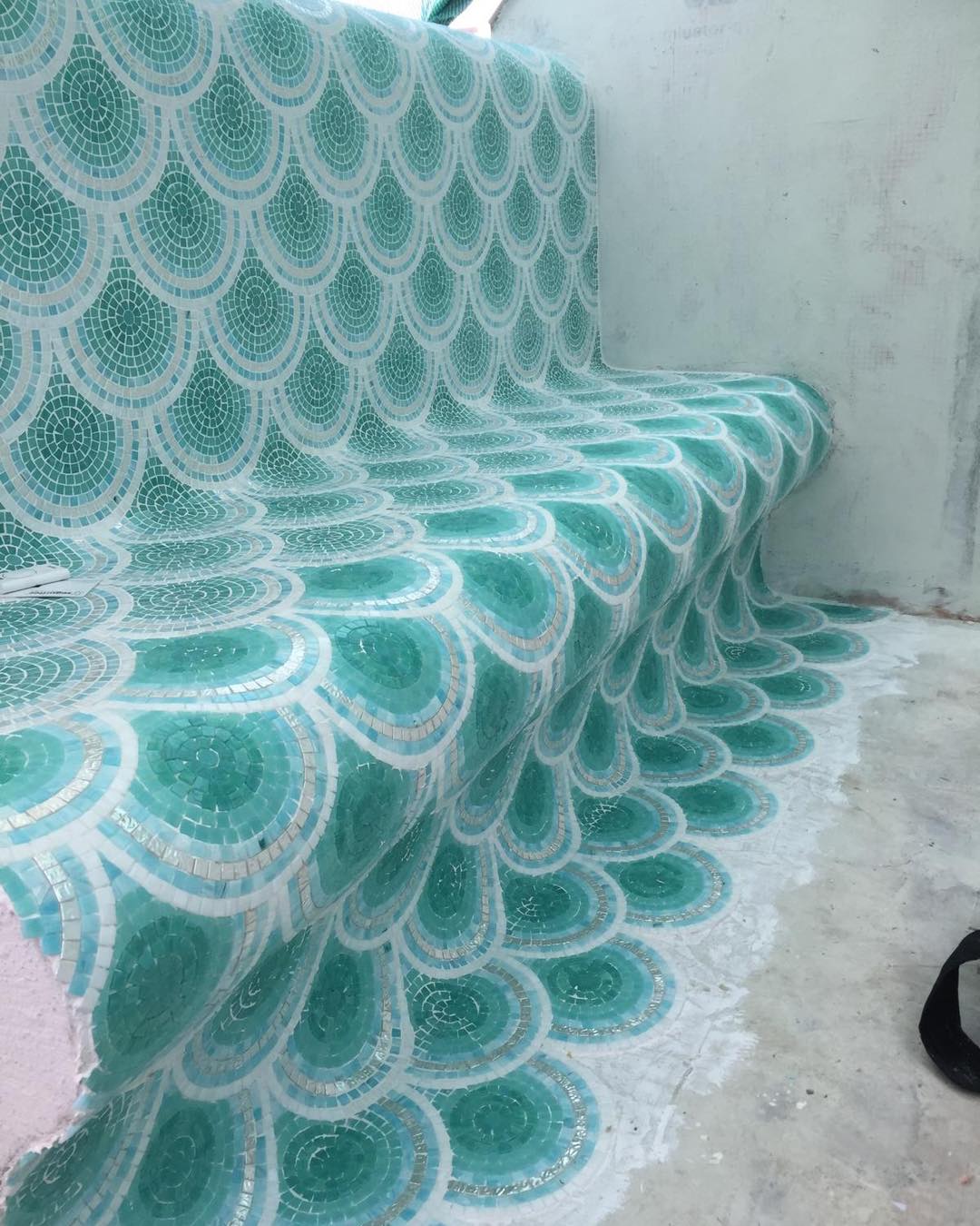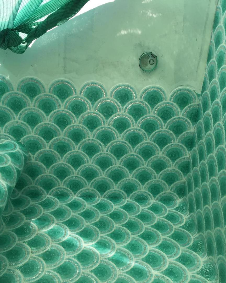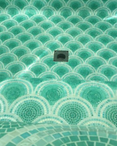 Für dieses außergewöhnliche Projekt kam das ikonische Bisazza Loop Green Mosaik zum Einsatz. Die geschwungene, wellenartige Struktur der Fliesen bringt Bewegung, Tiefe und einen Hauch von Luxus in den Raum.