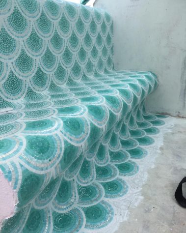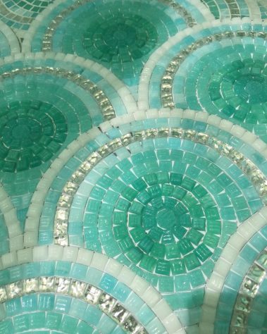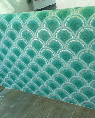 Der zarte Übergang von Türkis-, Grün- und Aquatönen schafft eine frische, mediterrane Atmosphäre – ideal für Wellnessbereiche, Terrassen, Duschen oder stilvolle Außenbereiche.
